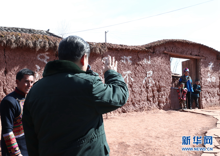 這是2月11日上午,習(xí)近平在涼山彝族自治州昭覺縣三岔河鄉(xiāng)三河村考察時(shí)同村民打招呼。 新華社記者 鞠鵬 攝