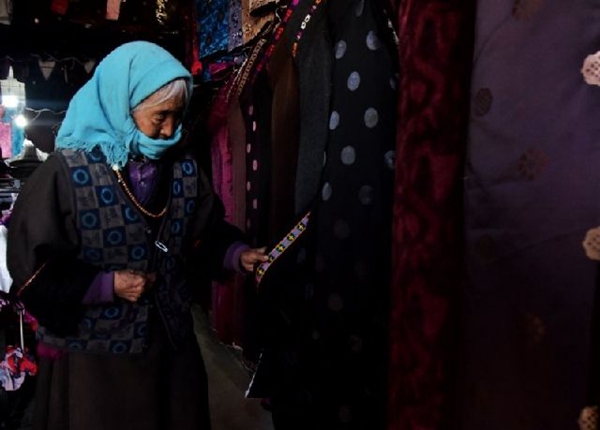 一位老人在旦增加的藏服店挑選衣服。新華社發(fā)(田文杰 攝)