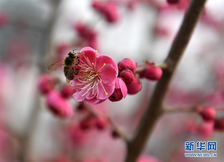 3月14日,在河北省石家莊市民心河畔,蜜蜂在花間采蜜。 新華社發(張震 攝)