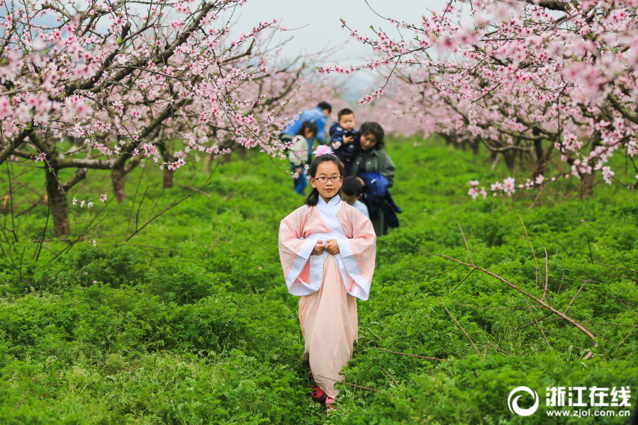 3月25日,身穿古裝的小朋友在浙江省寧波市橫溪鎮生態農業園內游玩。