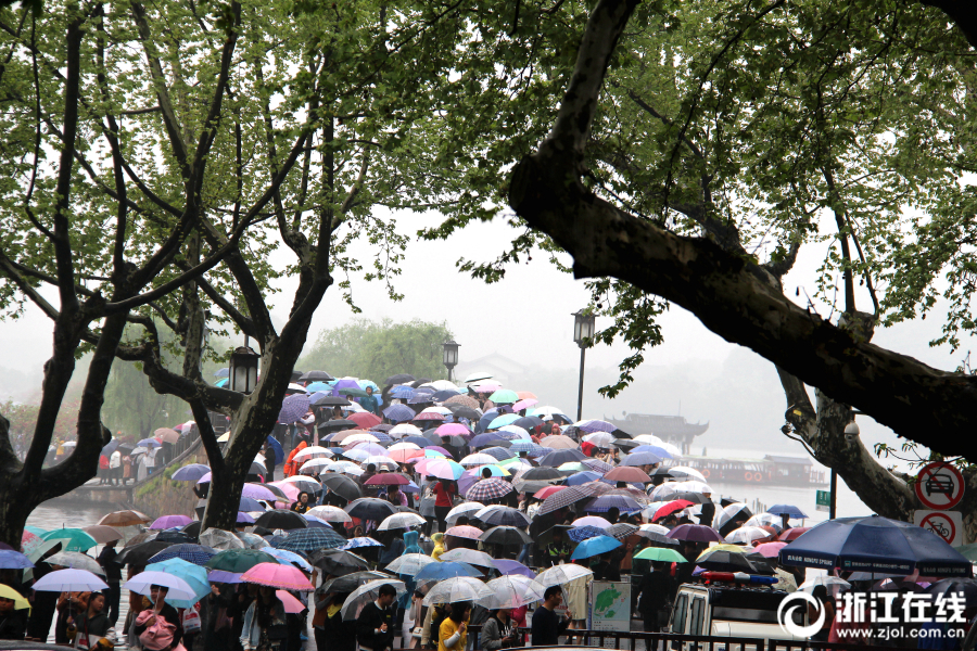 4月5日,清明小長假首日,杭州細雨綿綿,西湖景區游客絡繹不絕。杭城雖降雨降溫,但西湖景區前來賞花踏青的游客如潮,斷橋似人橋。(浙江在線拍友 里爾 柱子 攝)