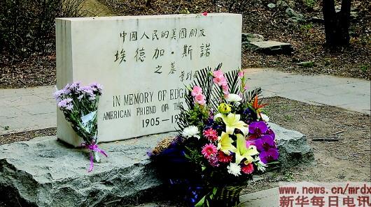 四月的北京大學(xué)未名湖畔,一片春意盎然。湖畔小路南側(cè)的斯諾墓前,整齊擺放著幾束鮮花,最外面的那束尤為新鮮。北京大學(xué)元培學(xué)院黨委書記、中國埃德加·斯諾研究中心主任孫華說,這是中安賓館的全體黨員來給斯諾先生掃墓留下的,中安賓館的原址是斯諾夫婦上世紀(jì)30年代在北京時(shí)的居住地。