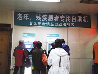 昨日,同仁醫(yī)院一樓門診大廳,老年人正在使用專用自助機。新京報記者 戴軒 攝 圖片來源:新京報