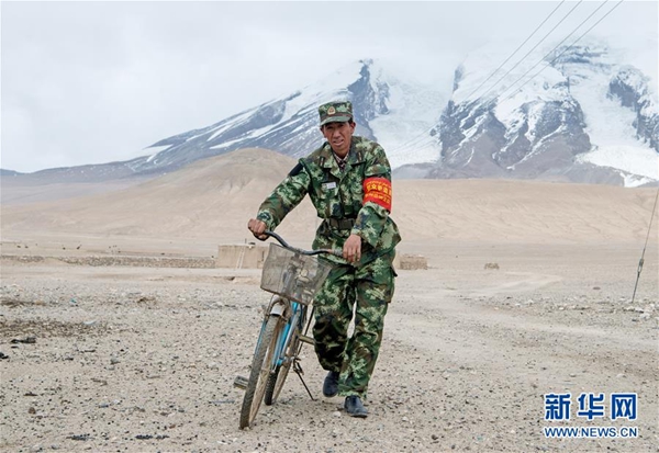 買買提努爾·吾布力艾山展示他前些年騎著巡邊的自行車(2017年5月6日攝)。新華社記者 江文耀 攝