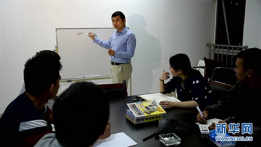 濟(jì)南翼菲自動(dòng)化科技有限公司創(chuàng)始人張賽與同事們開會(huì)(2017年9月25日攝)。新華社發(fā)