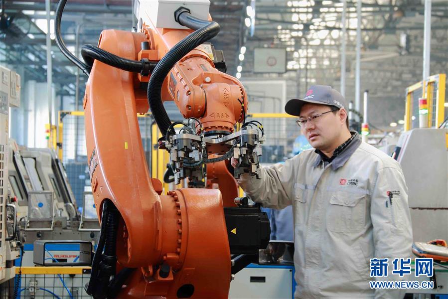 中國(guó)中車戚墅堰機(jī)車車輛工藝研究所有限公司首席技師劉云清在改進(jìn)中車戚墅堰所首條機(jī)器人渦輪殼生產(chǎn)線的機(jī)器人夾具(資料照片)。新華社發(fā)