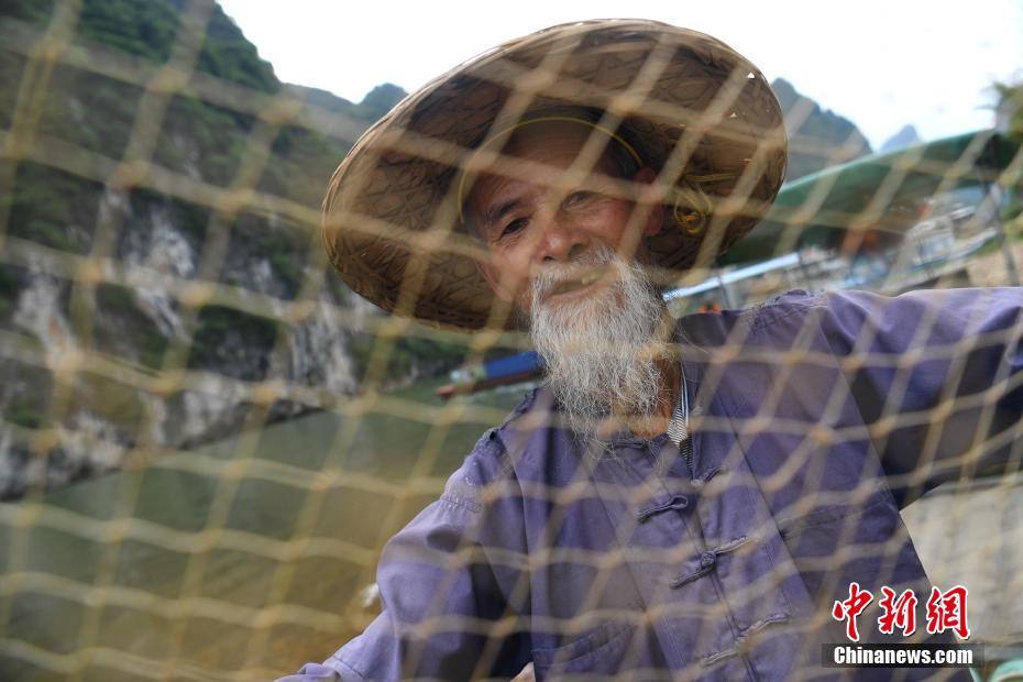5月5日,桂林陽朔,79歲的黃月創正在表演漓江傳統漁事。黃月創18歲就在漓江捕魚為生,隨著桂林旅游業的發展,他成為了再現“漓江漁火”擺拍模特中的一員。中新社記者 俞靖 攝