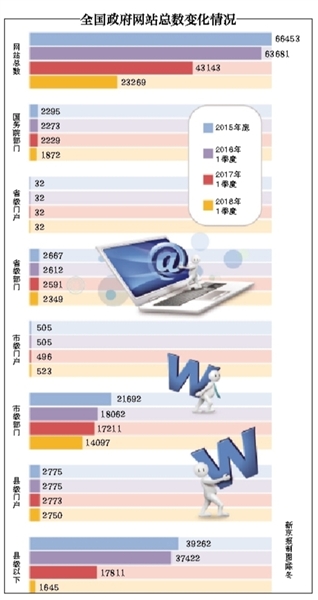 通報(bào)顯示,截至2018年3月1日,全國(guó)正在運(yùn)行的政府網(wǎng)站23269家,其中,國(guó)務(wù)院部門(mén)及其內(nèi)設(shè)、垂直管理機(jī)構(gòu)政府網(wǎng)站1872家,省級(jí)政府門(mén)戶(hù)網(wǎng)站32家,省級(jí)政府部門(mén)網(wǎng)站2349家,市級(jí)政府門(mén)戶(hù)網(wǎng)站523家,市級(jí)政府部門(mén)網(wǎng)站14097家,縣級(jí)政府門(mén)戶(hù)網(wǎng)站2750家,縣級(jí)以下政府網(wǎng)站1645家。