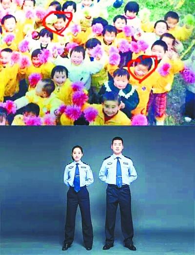 民警程通和黎銀月幼兒園的合影(紅圈圈內為兩人)和他們穿著警服的結婚照,讓人直呼緣分真奇妙。警方供圖