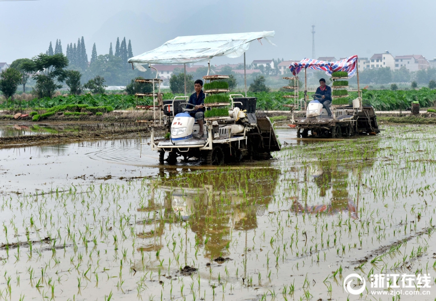 武義縣王宅鎮(zhèn)陶宅村種糧大戶方曉輝忙著插種單季稻。