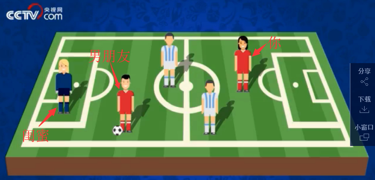 男:舉個例子,比如你和你的男朋友是一隊,你的閨蜜是對方的守門員。當你傳球給你男朋友時,你男朋友比任何時候都更加靠近你閨蜜。此時,你的男朋友就越位啦。