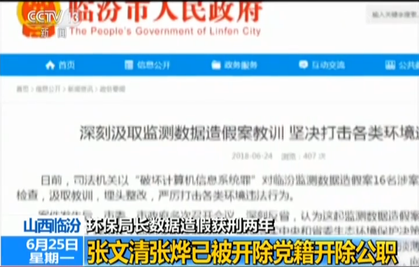就在昨天(24日),臨汾市人民政府通過其官方網站發布公告稱,5月27日,已對涉案人員市環保局原局長張文清、市環保局辦公室原負責人張燁2人作出開除黨籍、開除公職的處理;對市環境監測站原聘用人員張永鵬、李皇濤2人解除勞務合同。