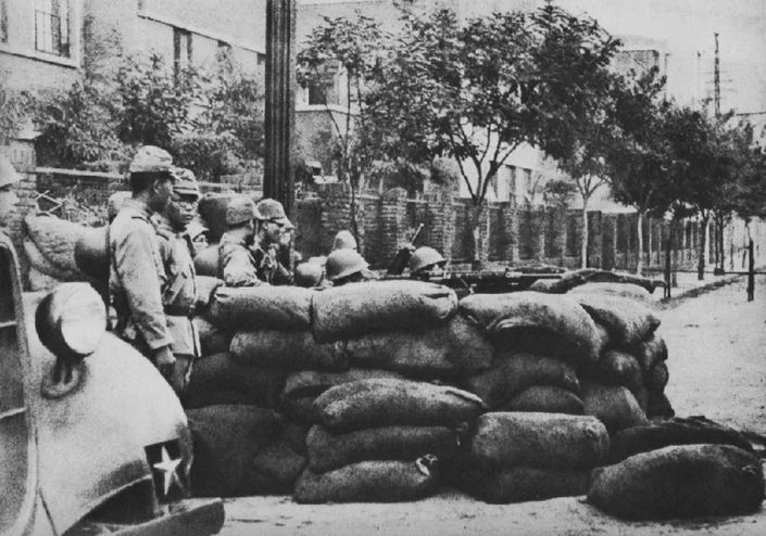 街頭掩體內(nèi)警戒的日軍士兵