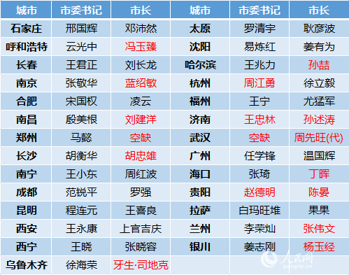 14個省會城市調整書記市長 兩個“一把手”職務空缺待補