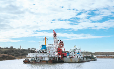 由中國港灣工程有限責任公司承攬,中國交建天津航道局有限公司承建的烏克蘭南方港糧食碼頭疏浚工程2018年1月30日舉行竣工簽字儀式。該項目解決了該港口被淤泥阻塞多年的困擾,對烏克蘭進一步擴大糧食出口具有戰略意義。圖為一組清淤單元在南方港施工。新華社記者 陳俊鋒攝