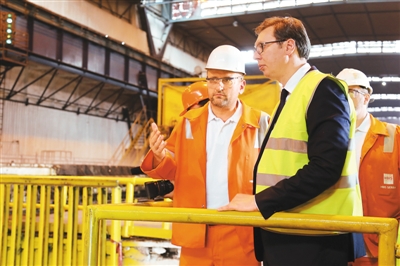 塞爾維亞總統武契奇7月5日出席河鋼塞爾維亞有限公司為正式接管斯梅代雷沃鋼鐵廠兩周年舉行的慶典時表示,中國公司的收購讓該廠獲得成功和進步。斯梅代雷沃鋼鐵廠成立于1913年,曾一度面臨倒閉。2016年,中國河鋼集團收購該廠。當年底,實現盈利。圖為武契奇(右)視察河鋼塞爾維亞有限公司。新華社記者 王慧娟攝