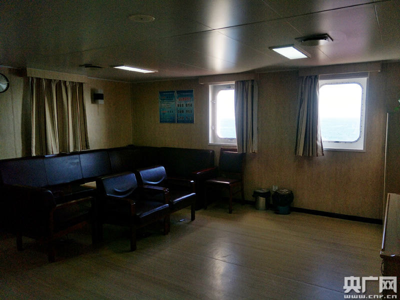 餐廳對面是船員休息區(qū),裝有衛(wèi)星電視。以前出海就相當于與外界隔絕。而現(xiàn)在,打開船上的電視,每天都能看到十幾個頻道的電視節(jié)目。茫茫大海上,雖遠離陸地,卻時時刻刻都可以看到國內最新動態(tài),信息無盲區(qū)。