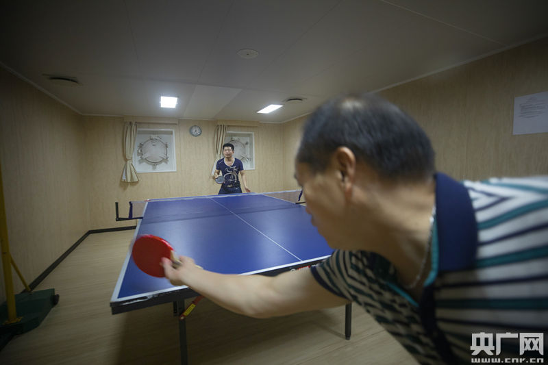 船員之家配有健身房,還有杠鈴、臂力器等器材,樓下還設有乒乓球室供船員們鍛煉。