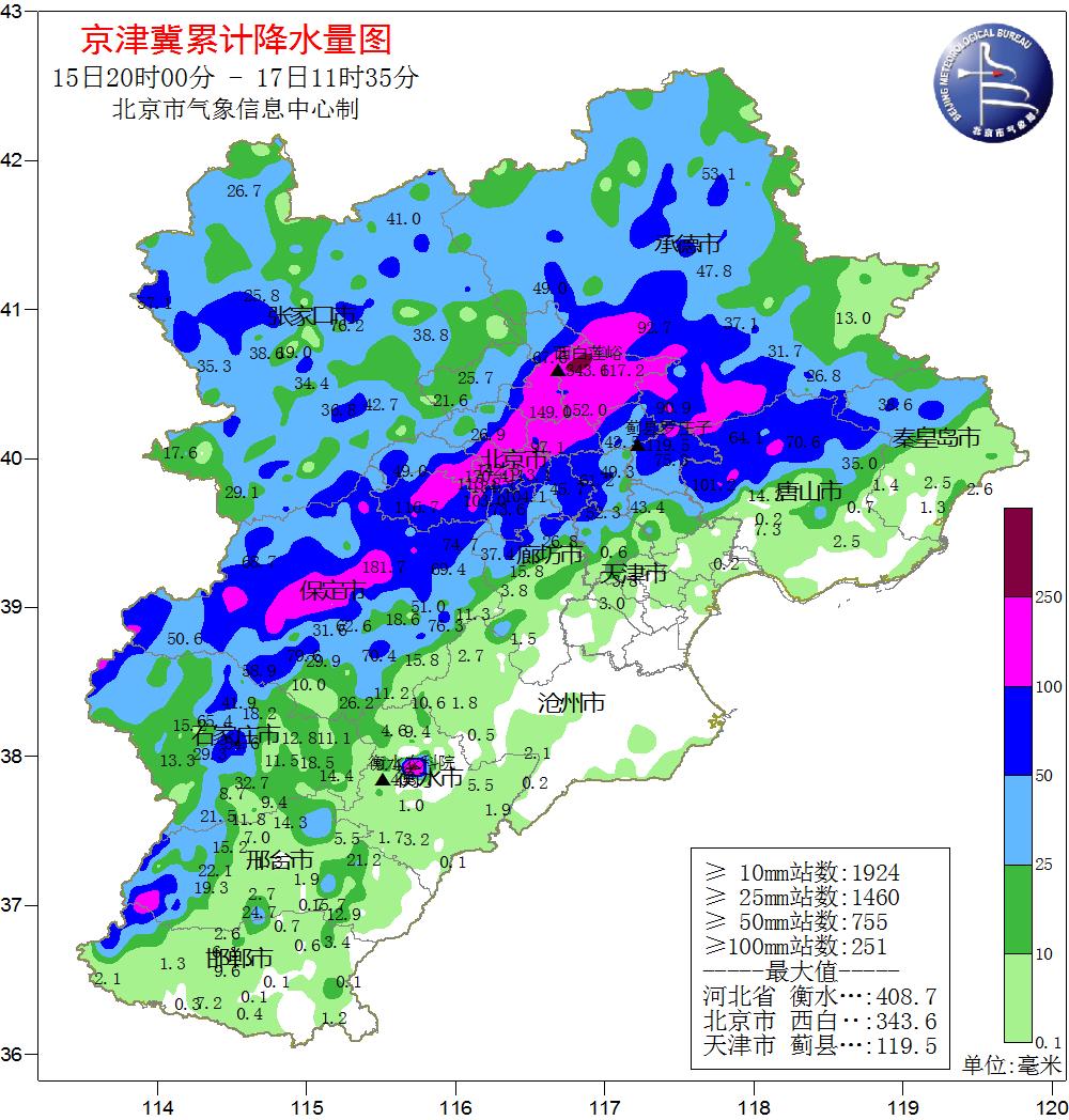 根據氣象觀測,15日20時至17日8時,北京市平均降水量達77.7毫米,城區平均100.9毫米,全市453個氣象觀測站中有121個超過100毫米、12個超過200毫米。其中,密云有2個測站超過300毫米,分別是西白蓮峪達(336毫米)和捧河巖村(302毫米)。