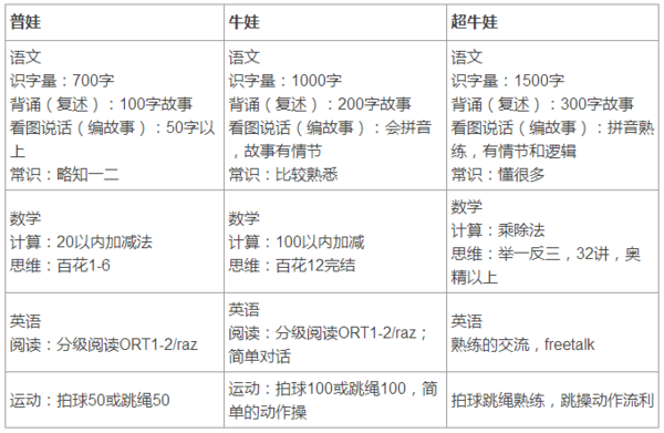 在許多存在“小學(xué)化”傾向的幼兒園和社會培訓(xùn)機構(gòu)內(nèi),“幼小銜接”被等同于知識的銜接,要求孩子提前學(xué)習漢語拼音、加減法和英語單詞等等。網(wǎng)絡(luò)上甚至流傳著一份“幼升小普娃牛娃配置表”,將處于“幼升小”階段的孩子依據(jù)掌握的語文、數(shù)學(xué)等方面的知識多少劃分為“普娃”、“牛娃”和“超牛娃”。這樣的認知無疑是極為片面的。過早進行知識性的學(xué)習,強調(diào)知識輸入,短期內(nèi)可能讓孩子獲得了入學(xué)的優(yōu)勢。但如果把眼光放長,則是撿了芝麻丟了西瓜。