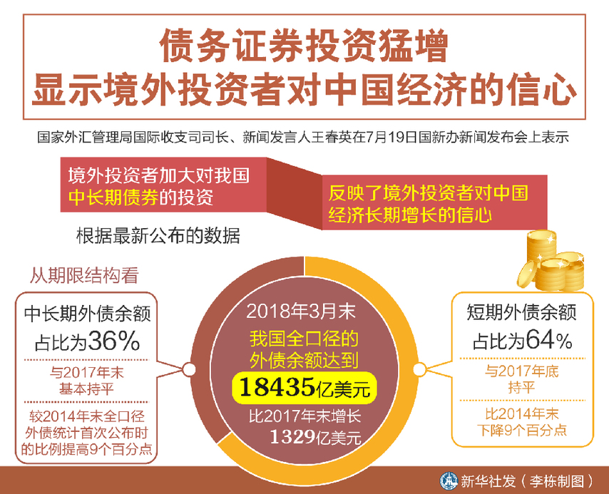 新華社北京7月19日電(記者劉開雄)“我們觀察新增長的外債中,有八成是債務證券。”國家外匯管理局國際收支司司長、新聞發言人王春英在19日國新辦新聞發布會上表示,境外投資者加大對我國中長期債券的投資,反映了境外投資者對中國經濟長期增長的信心。