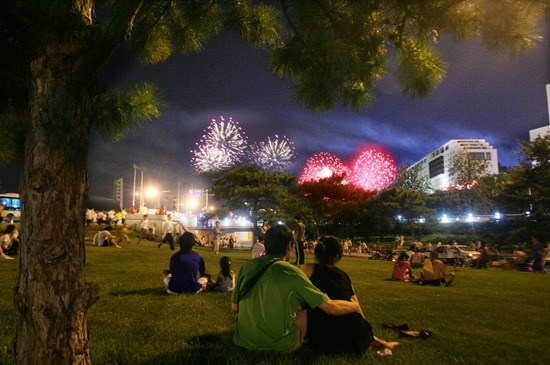 2008年8月2日,北京永定門,一對情侶觀看北京奧運(yùn)會(huì)開幕式預(yù)演的煙花。戴冰/攝