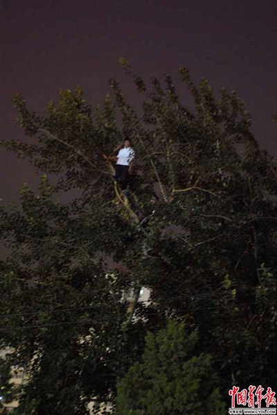 2008年8月8日,北京華嚴(yán)里小區(qū),兩名男子在樹上觀看奧運(yùn)會(huì)開幕式的煙花。中國青年報(bào)·中青在線記者 李雋輝/攝