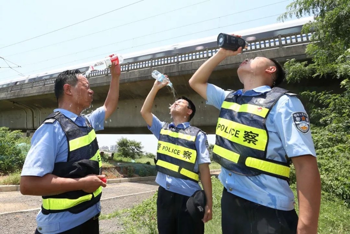 武漢鐵路公安處烏龍泉東所民警冒酷暑巡查后進行“降溫處理”。胡金力 攝