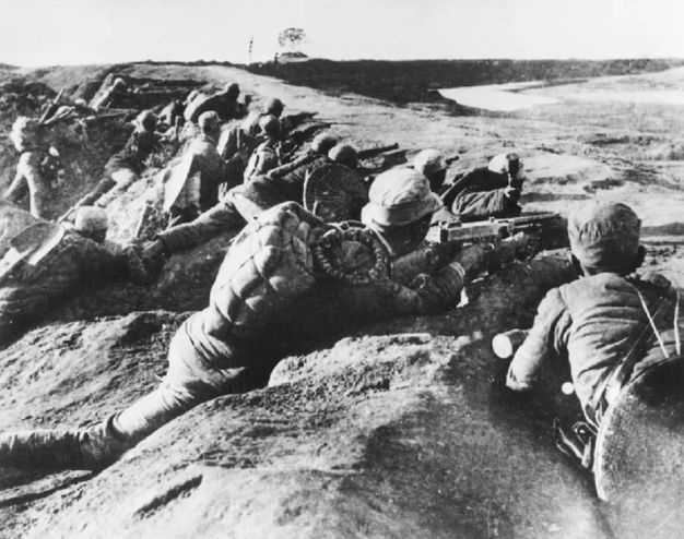 1937年抗日戰爭全面爆發后,中國共產黨在南方八省的紅軍及游擊隊改編為國民革命軍陸軍新編第四軍(簡稱新四軍)。這是1938年11月3日,新四軍戰士在馬家園戰斗中打擊敵人。新華社發