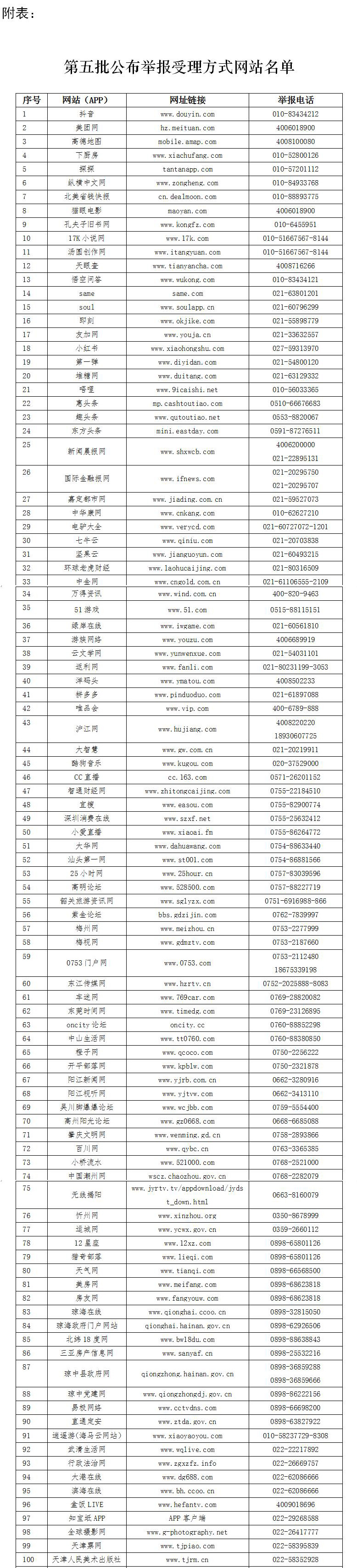 此次公布舉報受理方式的網站既包括新聞網站、商業網站、政府網站,又包括社區、論壇等互動平臺以及搜索引擎、電商、視頻直播、社交、游戲、APP應用程序等互聯網應用平臺,內容涉及新聞、財經、旅游、教育、文學、醫療衛生、生活服務等多個方面,其中,抖音、高德地圖等網民使用率較高的應用軟件,拼多多、唯品會等國內電商平臺,美團、下廚房等生活服務類網站在公布名單之列。