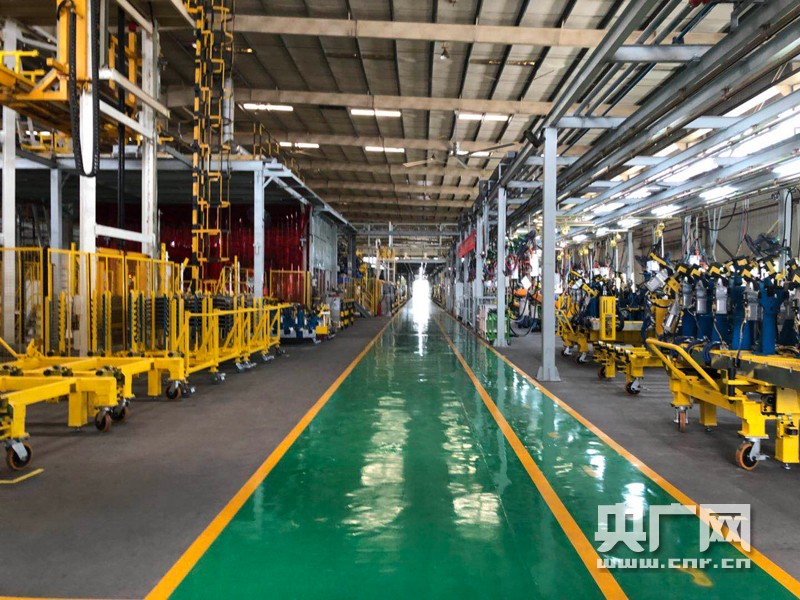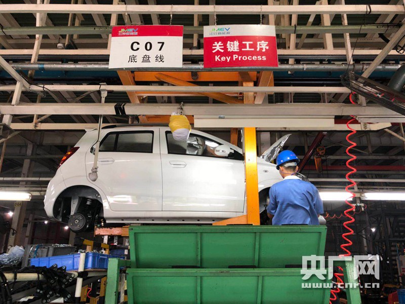 總裝廠內(nèi),工人正在為新車安裝底盤。底盤安裝是成車的重要工序,應(yīng)用了自動化程度較高的AGV循環(huán)小車進(jìn)行安裝。(記者 高寒露 攝)