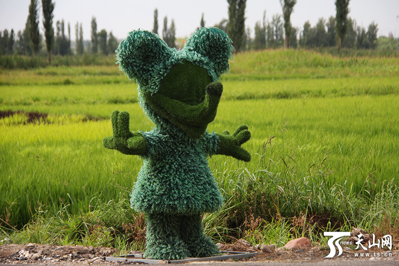 稻田畫“戰狼”、“功夫熊貓”。