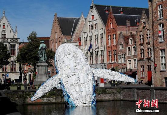 資料圖:當地時間7月2日,來自紐約布魯克林的建筑設計公司StudioKCA用從海洋中打撈起來的5噸塑料垃圾,打造了一個38英尺(約11.6米)高的巨型鯨魚“摩天大樓”(Skyscraper)。提醒人們關注塑料污染。