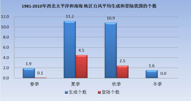圖2 1981-2010年西北太平洋和南海地區(qū)臺風(fēng)平均生成和登陸我國的個數(shù) 李慧 制圖
