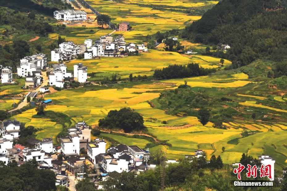 9月13日,在“中國最美鄉(xiāng)村”的江西婺源縣,正值收獲期的金黃水稻與周邊建筑構(gòu)成了一幅美好的田園豐收圖卷。中新社發(fā) 曹加祥 攝
