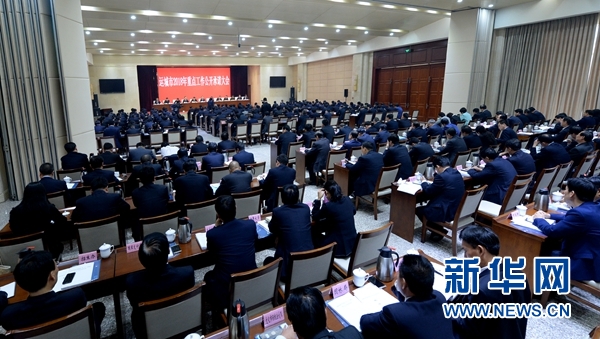 運城市2018年重點工作公開承諾大會會場(4月10日攝)。新華社發(fā)