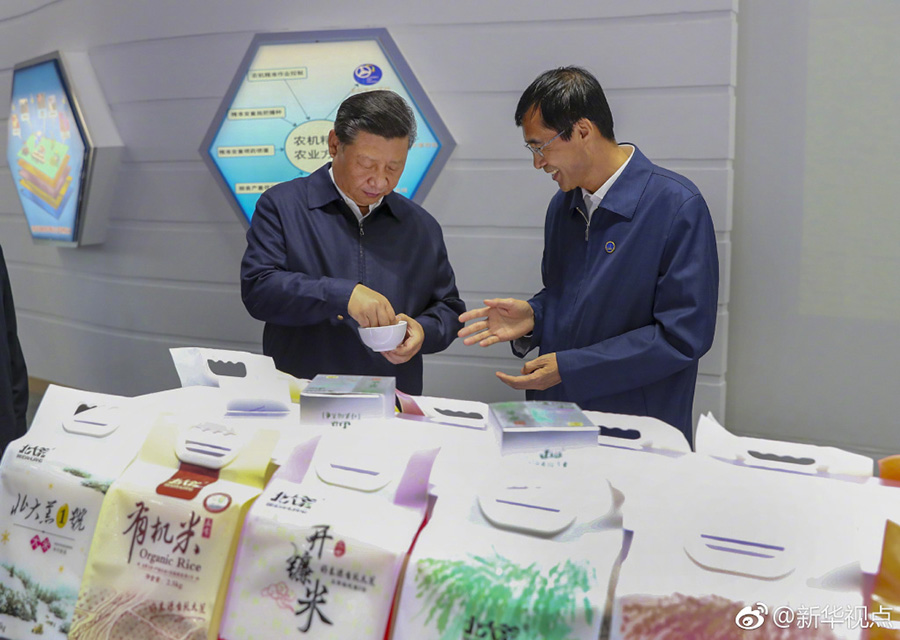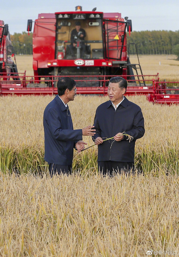 25日下午,首個“中國農民豐收節”剛過,習近平就深入三江平原腹地黑龍江農墾建三江管理局,考察糧食生產和收獲情況。他邊聽介紹,邊向農場負責人詢問今年收成如何、有沒有病蟲害、能否做到連年豐收,并強調中國人的飯碗任何時候都要牢牢端在自己的手上。在北大荒精準農業農機中心一樓大廳,當地出產的米油豆奶等各類農產品擺滿展臺。習近平走近前去,雙手捧起一碗大米,意味深長地說:“中國糧食,中國飯碗。”(文字:張曉松 攝影:謝環馳)