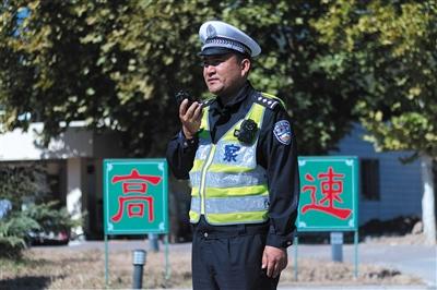 10月3日,北京八達嶺百葛服務區附近,昌平支隊高速路大隊機動警區警長王建立正在值勤。