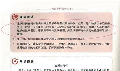“通過這些要求旨在引導學生以實踐探索的方式,更好地了解張衡及地動儀的相關知識,體會中國古人的智慧,增強民族自豪感,提升學生綜合素質。”人教社稱。