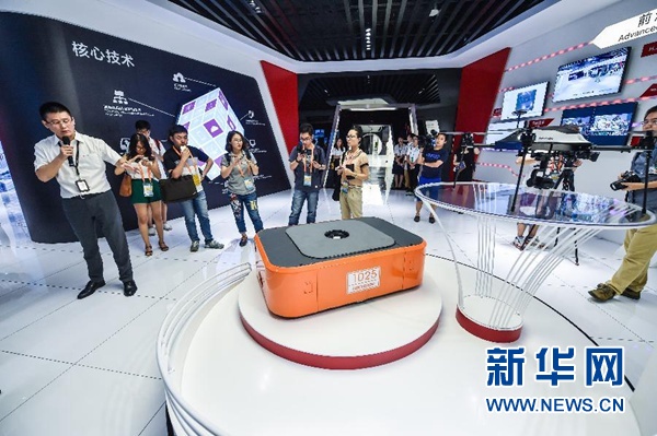 杭州??低晹底旨夹g股份有限公司工作人員向記者介紹公司研發的物流機器人(2016年9月2日攝)。新華社記者 徐昱 攝