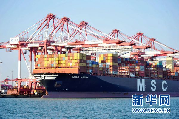 10月12日,集裝箱班輪在山東青島港外貿集裝箱碼頭裝卸集裝箱。新華社發(俞方平 攝)
