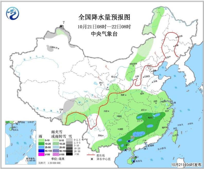 10月21日08時至22日08時,新疆塔城和阿勒泰地區、內蒙古東部、青海南部、西藏東部、川西高原北部等地的部分地區有小到中雪或雨夾雪,其中阿勒泰北部局地有大雪。江南中西部、華南西部和北部、海南島中東部等地有中到大雨,其中廣西中部和南部沿海、海南島東南部等地的局部地區有暴雨(50~70毫米)。內蒙古西部、甘肅中部有4~5級偏北風(見圖1)。