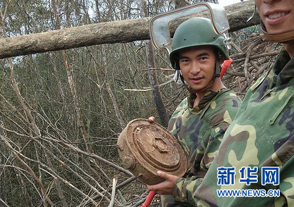 這是杜富國(左)在排雷現場(資料照片)。新華社發(楊萌 攝)