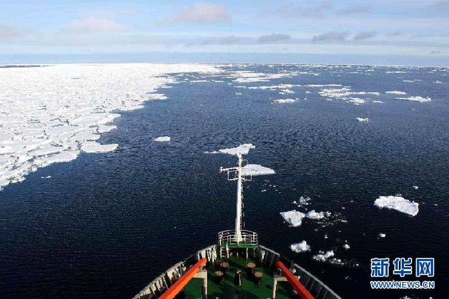 從“雪龍”號(hào)駕駛臺(tái)上放眼望去,浮冰鋪滿海面,時(shí)有冰山立于其間?!把垺碧?hào)沿著浮冰間的空隙行進(jìn),碾過浮冰的撞擊聲不時(shí)從船底傳來。為減輕船體的震動(dòng),航速有所下降,由原來的每小時(shí)15節(jié)左右降為目前的每小時(shí)9節(jié)左右(1節(jié)約合每小時(shí)航行1.852公里)。