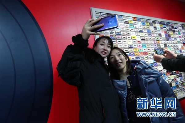 兩名參觀者在磁帶墻旁自拍留影。