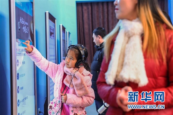 觀眾在新華社展項的“歲月羅盤”互動體驗項目前參觀。
