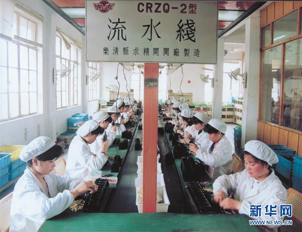“樂(lè)清縣求精開(kāi)關(guān)廠(chǎng)”(正泰集團(tuán)前身)車(chē)間(1984年7月攝)。?新華社發(fā)
