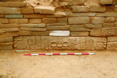 皇城臺為一處四圍包砌石砌護墻的高阜臺地,位于內城中部偏西?;食桥_臺頂的一些大型建筑坐落在一處大型臺基上。2018年,從這處大臺基南護墻倒塌的墻體石塊內,考古隊出土了30余件石雕作品,有一些石雕還鑲嵌在南護墻墻面上。這些石雕絕大多數是雕刻于石塊一面的單面雕刻,有符號、人面、神面、動物、神獸等,有一些畫面長度近3米,以中心正臉的神面為中心,兩側對稱雕出動物和側臉人面,體現出成熟的藝術構思和精湛的雕刻技藝。