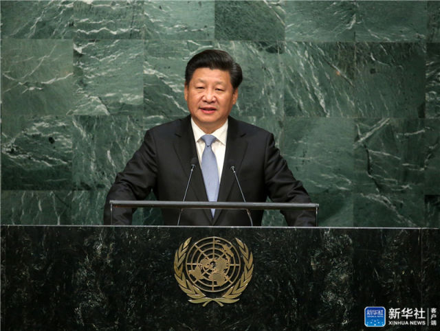 2015年9月28日,習近平在紐約聯合國總部出席第70屆聯合國大會一般性辯論并發表題為《攜手構建合作共贏新伙伴 同心打造人類命運共同體》的重要講話。新華社記者 龐興雷 攝