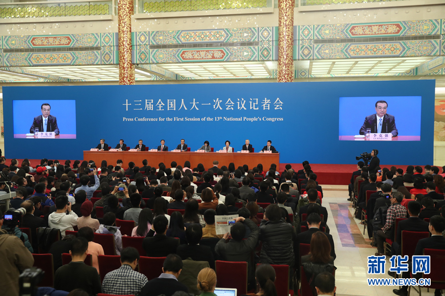 3月20日上午,十三屆全國人大一次會議閉幕后,國務院總理李克強在人民大會堂三樓金色大廳會見采訪十三屆全國人大一次會議的中外記者并回答記者提出的問題。圖為記者會現場。 新華網/中國政府網 翟子赫 攝